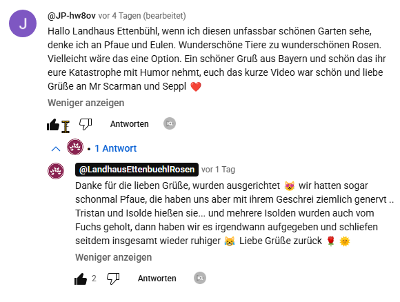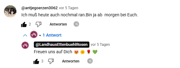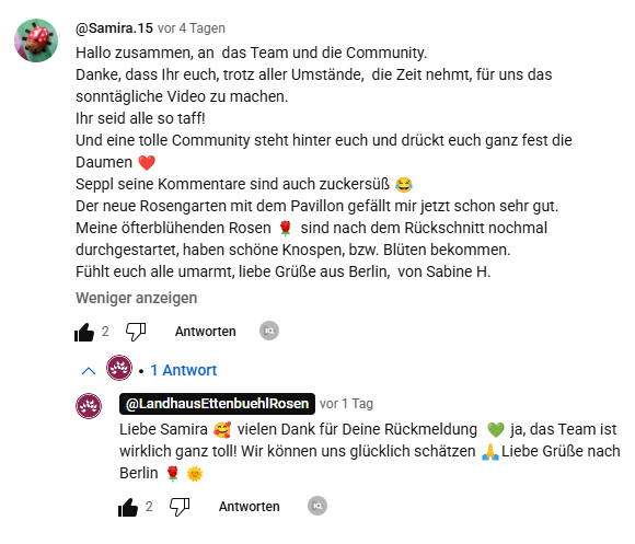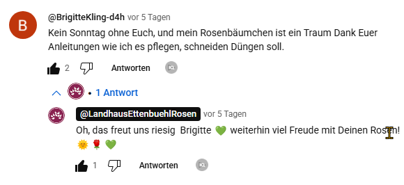 Rosalila, Rose and cat lover„In der Community kommen immer wieder neue Fragen auf, durch die ich ständig etwas Neues lernen kann und so weiter wachse. Alle Inhalte im Kanal finde ich für Rosenpflanzen wichtig, aber besonders die Lektionen zum Rückschnitt haben es mir angetan. Endlich habe ich den Mut, auch tiefer und falls notwendig radikaler einzugreifen, um eine schönere und gesündere Pflanze mit vielen Blüten zu erzielen.