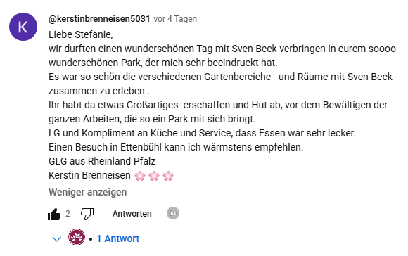 Für meinen Garten habe ich die Idee mitgenommen, ihn nach dem Vorbild vom Landhaus Ettenbühl umzugestalten. Dabei habe ich keine Angst mehr vor der Umsetzung, weil ich mich sehr gut vorbereitet fühle.