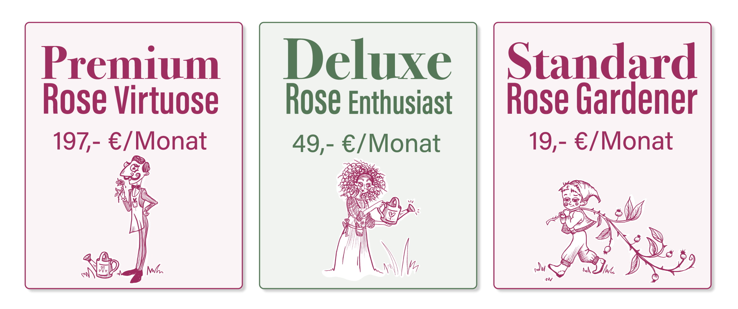 Beispiel: Wenn Du Dich für die mittlere Version entscheidest, also Deluxe Rose Enthusiast, dann erhältst Du alle dort aufgeführten Inhalte, inklusiv der Inhalte der Grundstufe Standard Rose Gardener. Hingegen die zusätzlichen Angebote und Nutzen des Levels Premium Rose Virtuoso sind hier nicht enthalten. Du kannst aber später jederzeit upgraden (oder auch down-graden nach gewähltem Abrechnungs-Zeitraum).